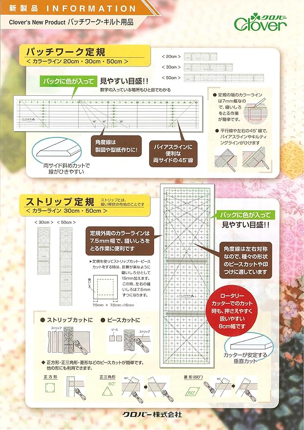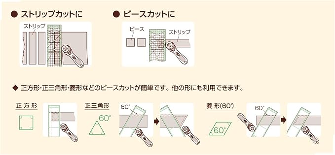 押さえやすい8cmの広幅でピースカットに必要な角度線も充実しています。ロータリーカッターを使ってのストリップカット、ピースカットにおすすめ。