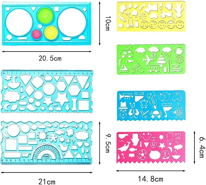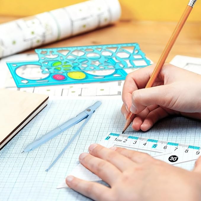 コンパスはABS樹脂と亜鉛合金製で、耐久性があり、操作もスムーズです。近視防止定規は視力保護を考慮して設計されており、健全な学習を促進します。 9ピースのテンプレート定規セットには、様々なツールを整理して簡単に取り出せる収納ポーチが付属しています。細部に至るまで、使いやすさを追求した設計です。