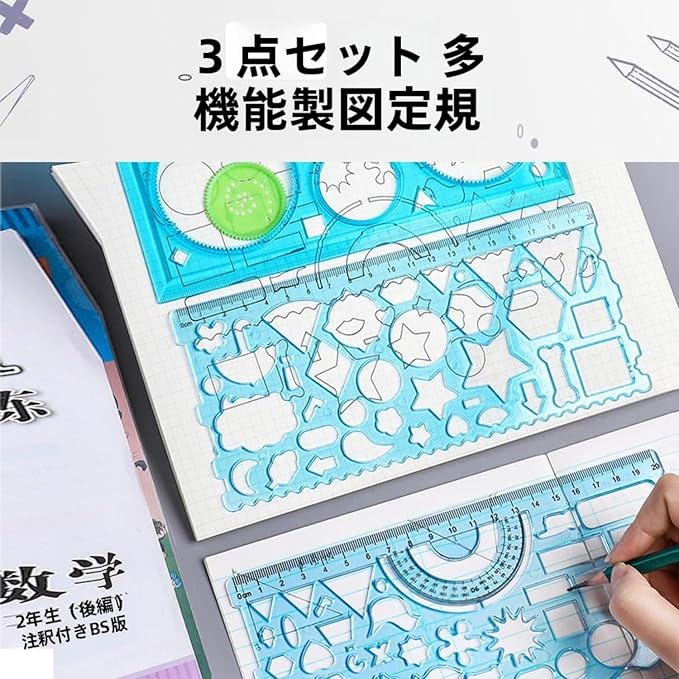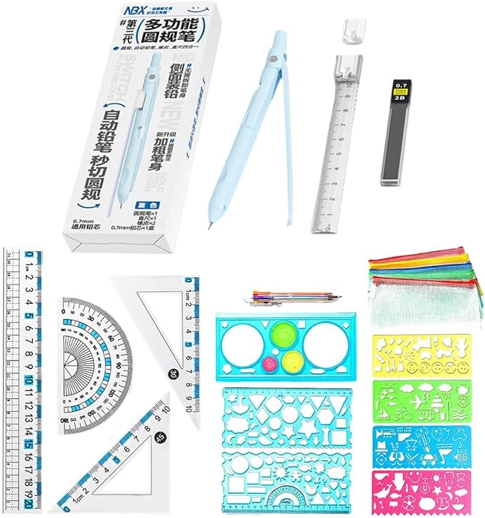 コンパスは、コンパス、定規、消しゴム、鉛筆が一体化しており、描画時に他のツールを探す手間が省けます。4点セットの近視防止定規セットは、一般的な筆記や描画に役立ち、近視予防にも役立ちます。9点セットのテンプレート定規セットには、様々な定規と色鉛筆が含まれており、描画、テンプレートサポート、着色まで、あらゆる用途に対応できます。