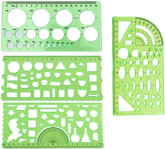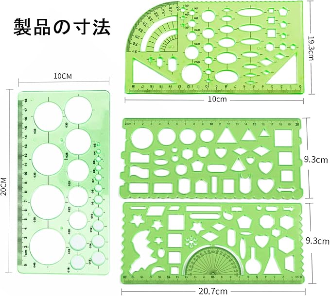 【幾何尺テンプレート】4つの緑色の幾何尺テンプレートを含み、良質なプラスチックで作られ、耐久性があり、軽量で、六角形、円形、楕円形、楕円形、三角形などの様々な形状があり、学校やオフィスで使用するのに適した異なる図案を描くことができます。
