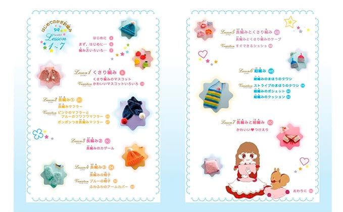 糸の取り出し方から針の持ち方、ゲージや編み記号についてまで、全作品の作り方を丁寧に解説します。