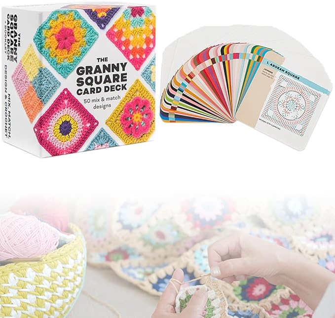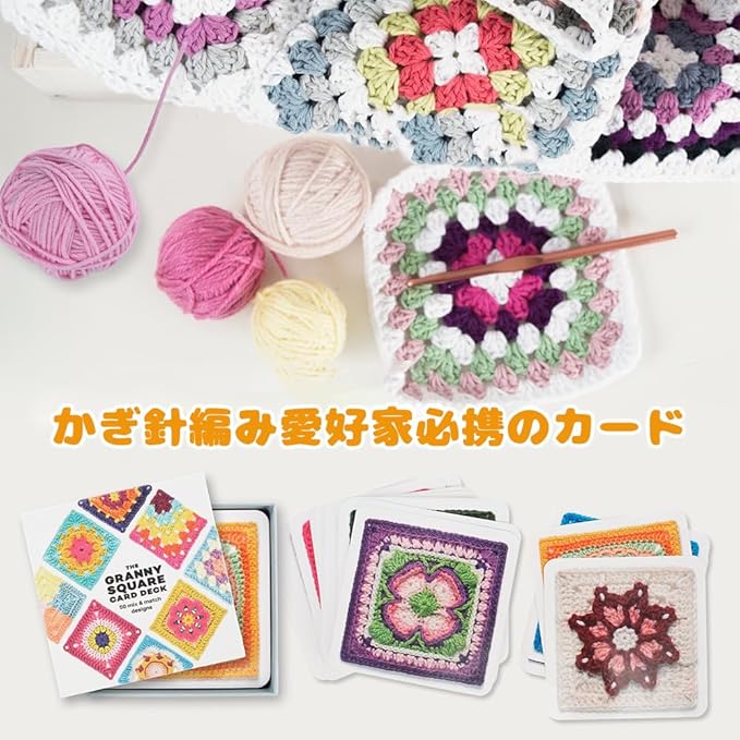 【美しいグラニースクエアデザイン】各カードには、完成したグラニースクエアのカラー写真が掲載されており、自由に並べたり組み合わせたりして、自分だけのデザインを作ることができます。カードを裏返すと、詳細なかぎ針編みの図と接続方法の説明があり、初心者でも簡単に編み始められます。