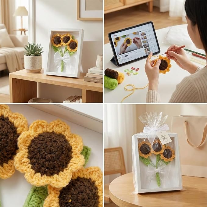 【暮らしを彩る枯れない花】 完成したひまわりは、温かいニットフラワーの置物として飾れます。玄関飾り、リビングなどインテリアに最適。水やり不要で、ずっと綺麗に飾れます。