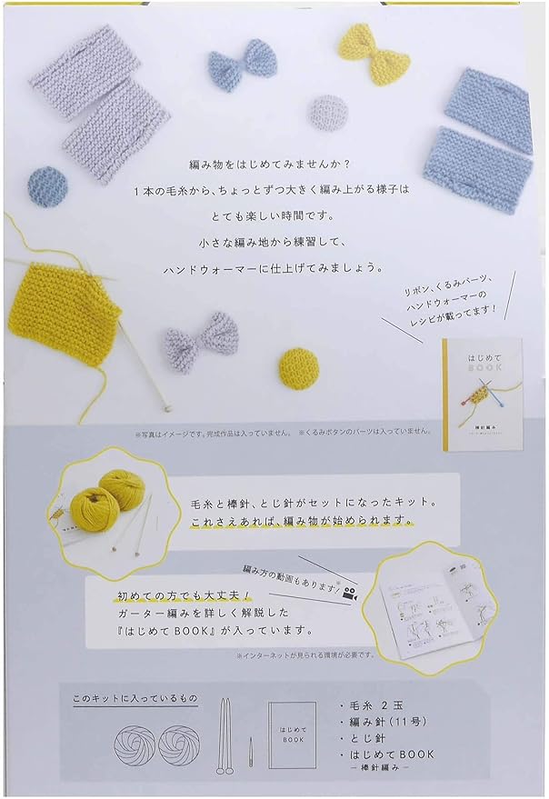毛糸2玉と棒針、とじ針、『はじめてBOOK』がセットになったキットで、これさえあれば、すぐに編み物が始められます。