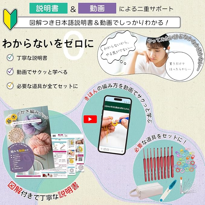 【おすすめポイント】◆ 初心者にも安心!きほんの編み方ミニブック付きで練習スタート ◆ 9サイズのかぎ針で毛糸の太さに合わせて自由に選べる ◆ 収納バッグ付きで持ち運び&整理ラクラク ◆ ギフトにも最適!かわいいパッケージで贈り物にもぴったり