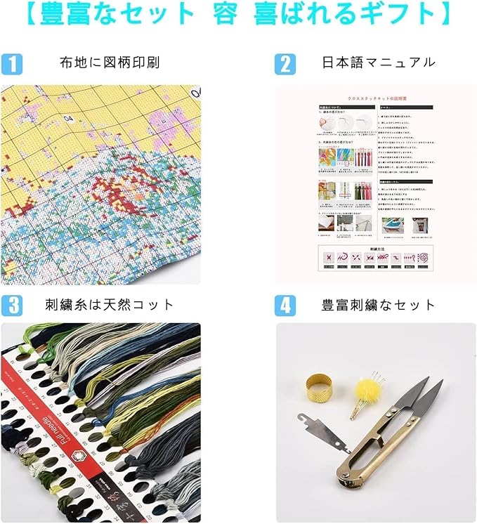 【快適な使い心地】布にパターンがプリントされるため、布目を数える必要がなく、初心者でも楽しめます。また、刺繍糸はそれぞれ番号付きの台紙にセットされ、必要量より30%増量され、紛失などの心配はありません。さらに、作品が出来上がった時には達成感が得られ、成功体験と自信に繋がります。お子様からお年寄りの方まで幅広い年齢層の方にご愛用いただけます