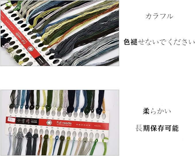 【厳選された素材】刺繍糸は天然コットンで作られ、滑らかな質感と柔らかい肌触りを兼ね備えます。丈夫で耐久性に優れ、色あせや色落ちもしにくく、長くご愛用いただけます。また、豊かな発色と美しい光沢により微妙な色合いの変化を表現し、明るい雰囲気を演出してくれます。さらに、無毒の洗える染料で染められ、子供やペットがいるご家庭でも安心にご利用いただけます