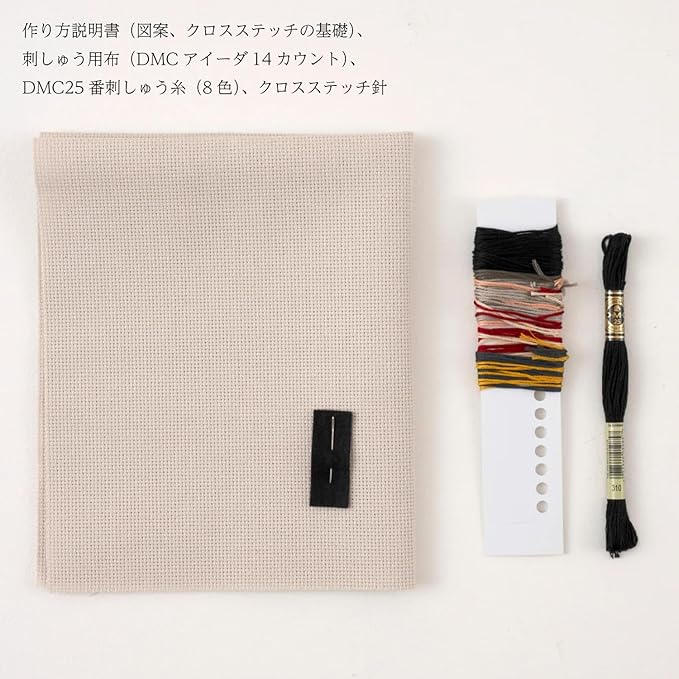 【内容】作り方説明書(図案、クロスステッチの基礎)、刺しゅう用布(DMC14カウント)、DMC25番刺しゅう糸(8色)、クロスステッチ針No.24