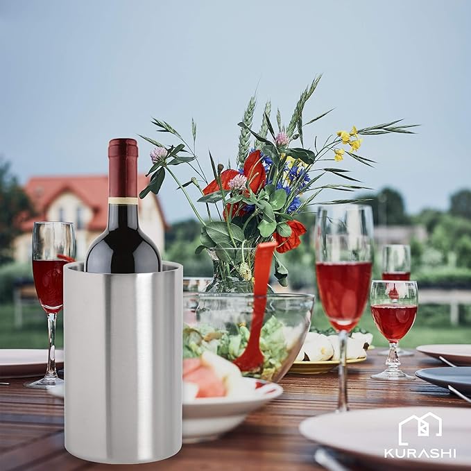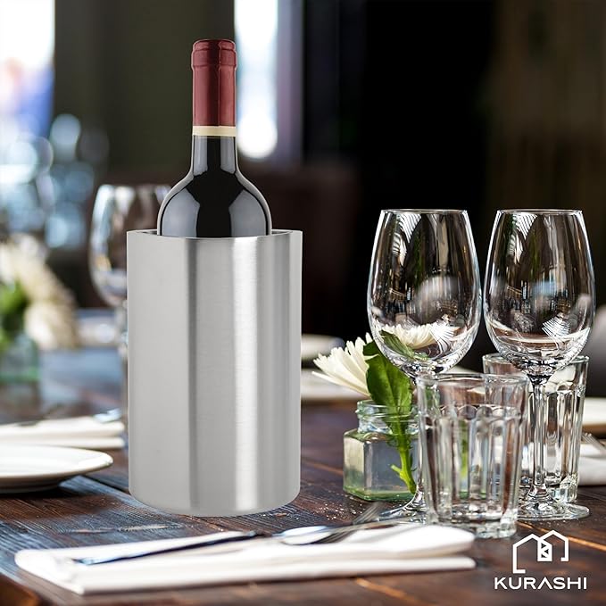 KURASHIのホームをより快適に演出するために、卓上に置けるステンレス製のワインクーラーをご紹介します。シャンパンボトルにも対応し、二重構造で冷たさを保つことができます。スタイリッシュなデザインのステンレス製ボディは、どんなインテリアにもマッチし、モダンな雰囲気を演出します。コンパクトなサイズで置き場所を選ばず、お手入れも簡単なので、忙しい日常にも最適です。ワイン愛好家にとっても、おしゃれなプレゼントとしても喜ばれるアイテムです。冷たいままワインやシャンパンを楽しむために、ぜひこの卓上ワインクーラーをKURASHIのホームに取り入れてみませんか?上質なデザインと機能性が、快適な空間を演出します。