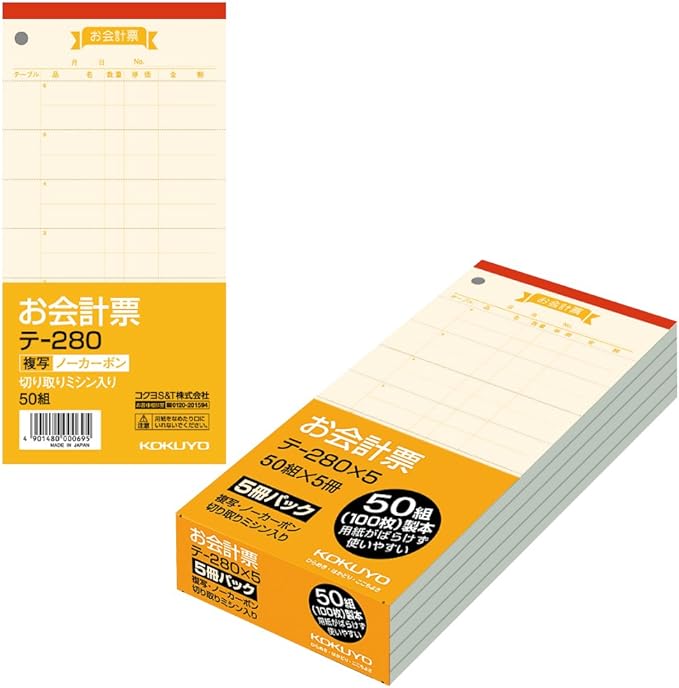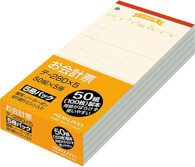 ●ノーカーボン複写、切り取りミシン入りお会計表の5冊パックです。