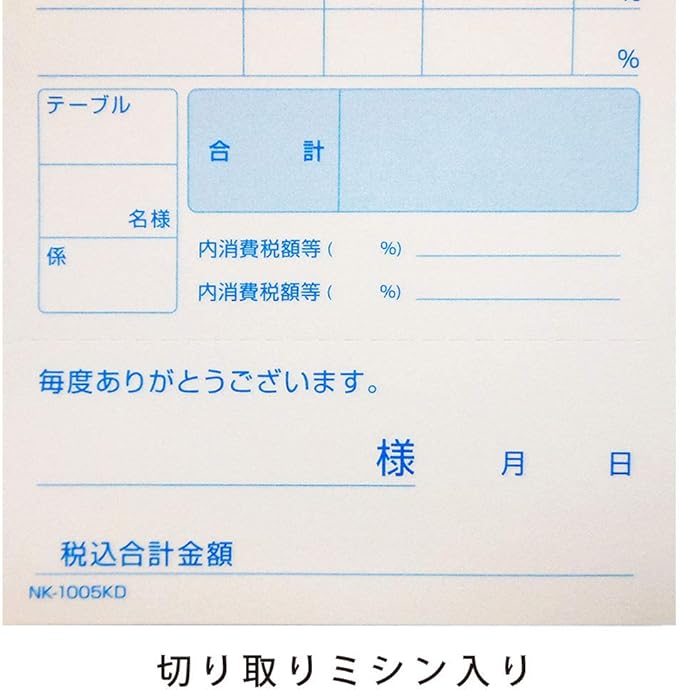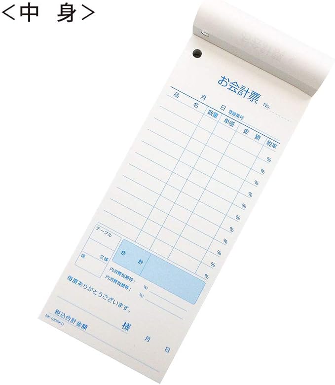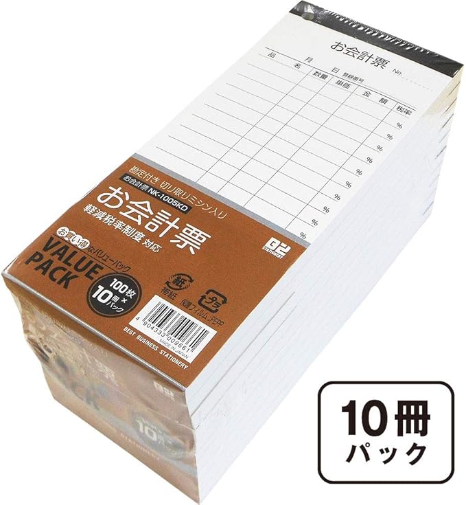 シンプルで使いやすいお会計票。複写なしタイプ。テーブル番号、~名様の記入欄あり。1冊あたり100枚綴り。お得な10冊パックでまとめ買いに便利。