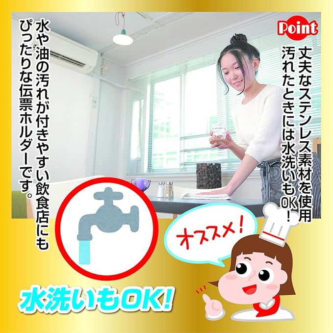 丈夫なステンレス素材を使用、汚れたときには水洗いもOK!水や油の汚れが付きやすい飲食店にもぴったりな伝票ホルダーです。