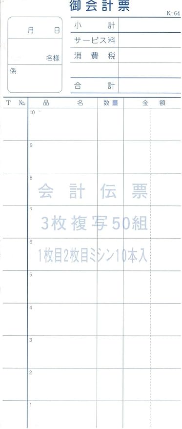 会計伝票 K-641 3枚複写50組 10冊 1枚目2枚目ミシン10本入り 会計票