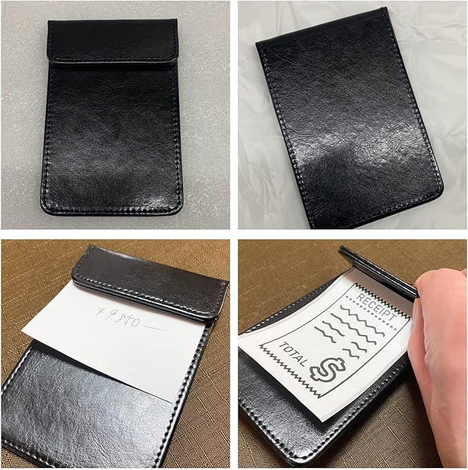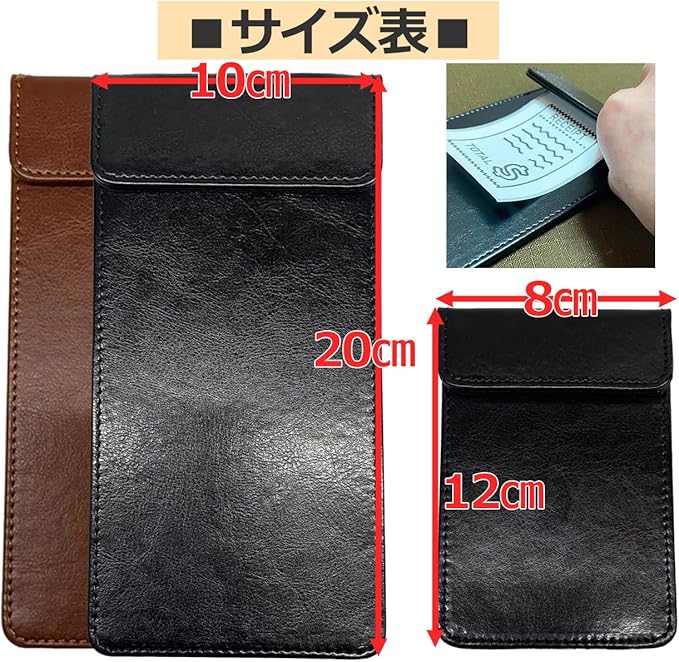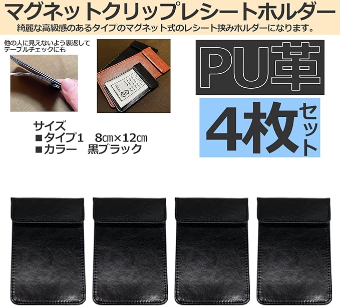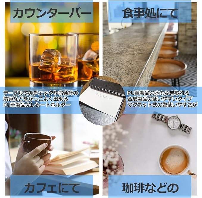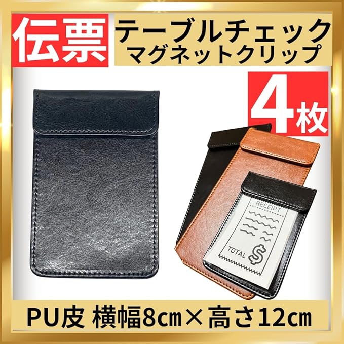 テーブルチェックなどを行う際にお会計のレシートを挟んで置けるマグネット式の伝票挟みになります 業務用としても使いやすい、汚れたら拭き取ることができるPU革製(ポリエステル素材)