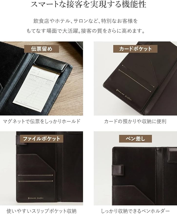 ビジネスを格上げする本革伝票ホルダー。 洗練されたデザインと機能性を兼ね備えた伝票ホルダー。 お会計やカードの受け渡しをスマートに演出し、接客に品格を加えます。 熟練の革職人が一つひとつ丁寧に仕上げた逸品。