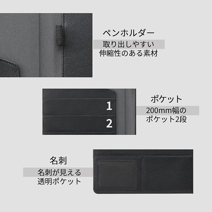 ペンホルダー、L字型ポケットホルダー、200㎜幅のポケット2段、名刺サイズのポケット2つと、多彩な収納がありつつ、厚みを抑えスリムな形状で、カバンの中でもかさばらない。