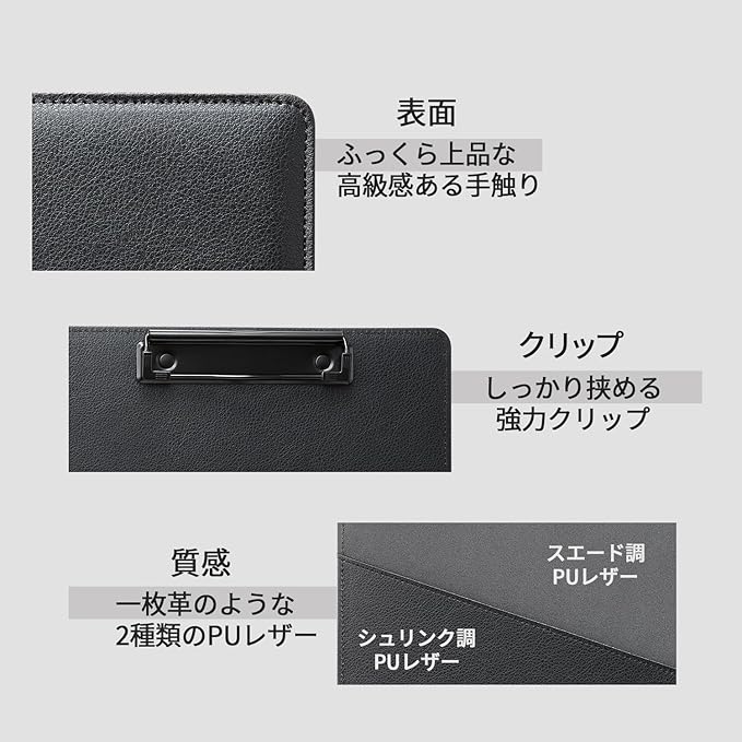 ・シュリンク調とスエード調の合成皮革が革小物のような高級感を感じさせるクリップファイル。