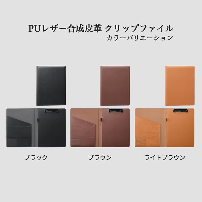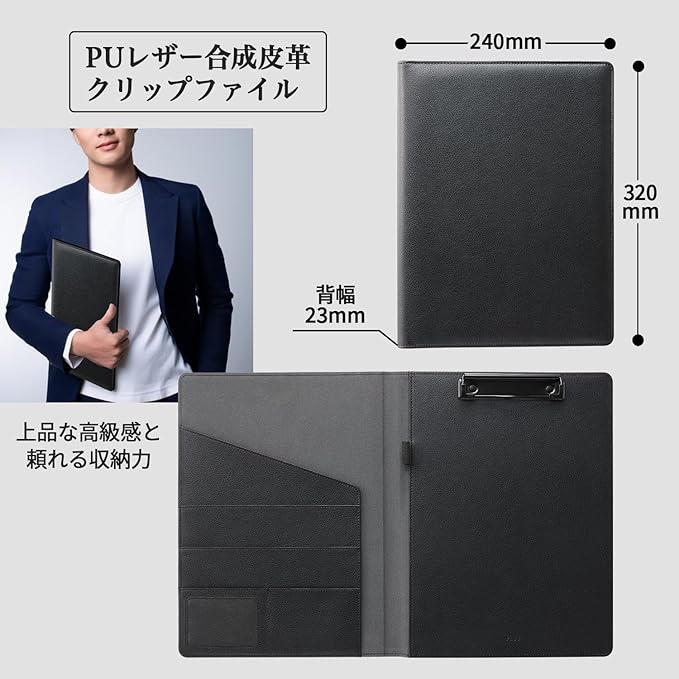 【外形寸法(約)】縦320mm 横240mm 背幅23mm(※折りたたんだ状態の寸法)【材質】表地(PU合成皮革)、透明窓付きポケット(PVC)、クリップ金具(スチール)