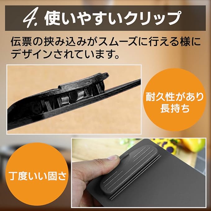 【使い易いクリップ】 クリップ部分は 伝票の挟み込みがスムーズに行えるように作られています。しっかりしたバネがついているので使用していくうちに緩くて使えなくなるような心配がありません。