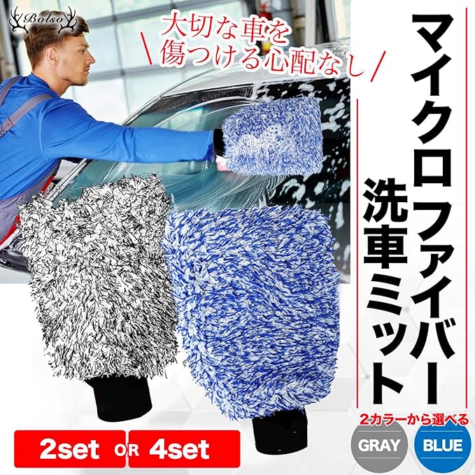 BOLSO マイクロファイバー 洗車ミット 洗車グローブ 2枚 セット 洗車 カーウォッシュ グローブ ミット (ブルー2枚)