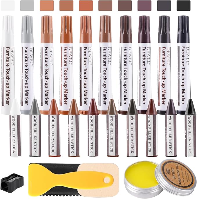 DEWEL 木製品キズ補修セット 家具 補修ペン 家具補修マーカー フローリング補修 10色補修ペン 10色補修棒 床 ドア剥がれ 棚 家具補修 キズ隠し ひび割れ、傷、焼灼、変色など補修 芯削り器付き 20本セット 家具の傷、汚れ用