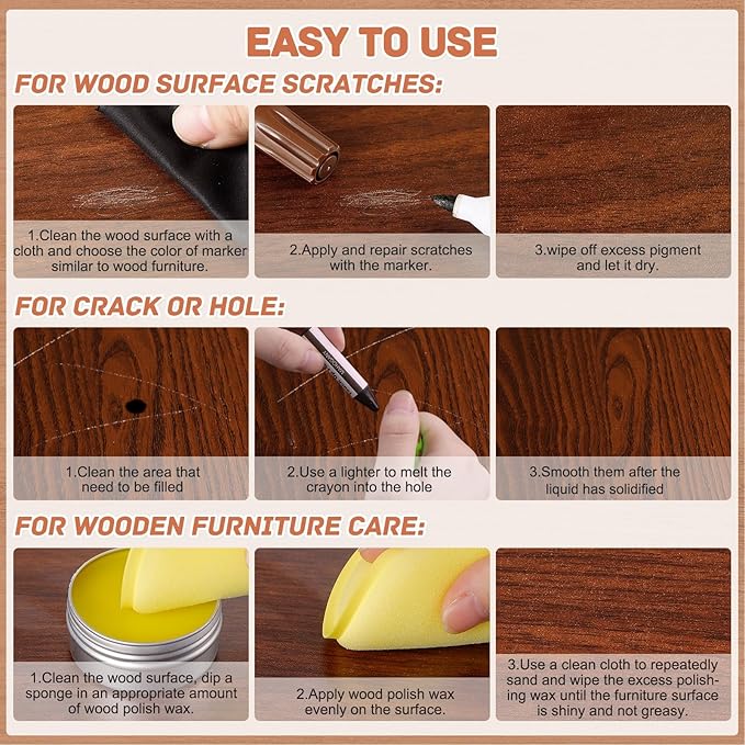 【家具きれいに研磨でき】こちらの補修セットの中に25gのウッドワックスと一本のスポンジが含まれており、家具を補修した後、スポンジで適当なウッドワックスを塗って家具に研磨して家具をより光沢のある美しく見せ、湿気や傷から家具を保護することもできます。