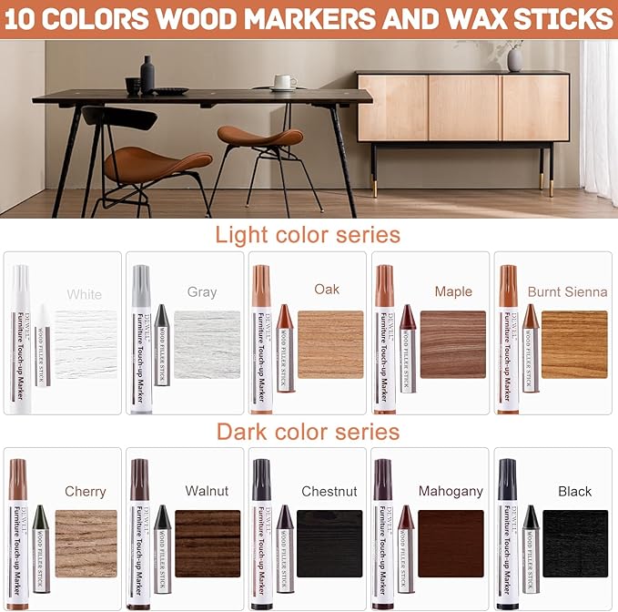 【様々な使用場面】 ➤こちらの木製品補修キットは、テーブル、椅子、ベッド、床、ドア、クローゼットなどの木製家具の傷(くず、ひび割れ、へこみ、ペットの跡、擦れ、変色など)を補修して隠すことができます。家具をきれいに恢復し、心地も楽々になります。