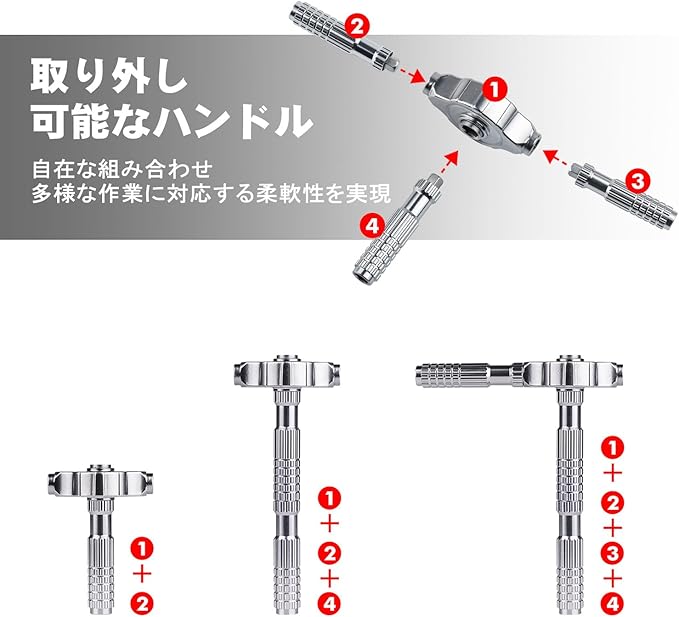 組み合わせ式ハンドル:セットには、3個の接続部品とラチェット機構が含まれており、これらを自由に組み合わせることができます。このデザインにより、狭いスペースや特殊な角度での作業がスムーズに行えます。特に、複雑な機器の内部作業や、アクセスが難しい場所での使用に便利です。