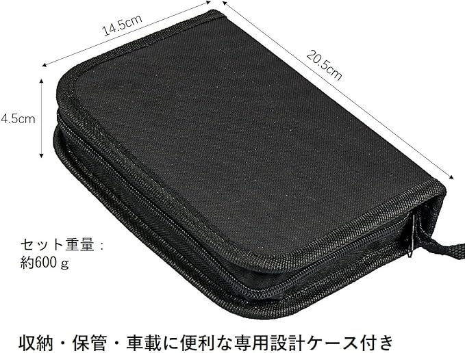 タイヤシールラバー 15、T字型フックニードル 1、T字型リーマー 1、付け替え用ニードル 1、リーマー針 1、六角レンチ 1、ペンチ 1、バルブ工具 1、バルブコア 8、金属バルブカバー 4、プラスチックバルブカバー 8、タイヤ空気圧計 1、ナイフ 1、専用収納ケース 1。