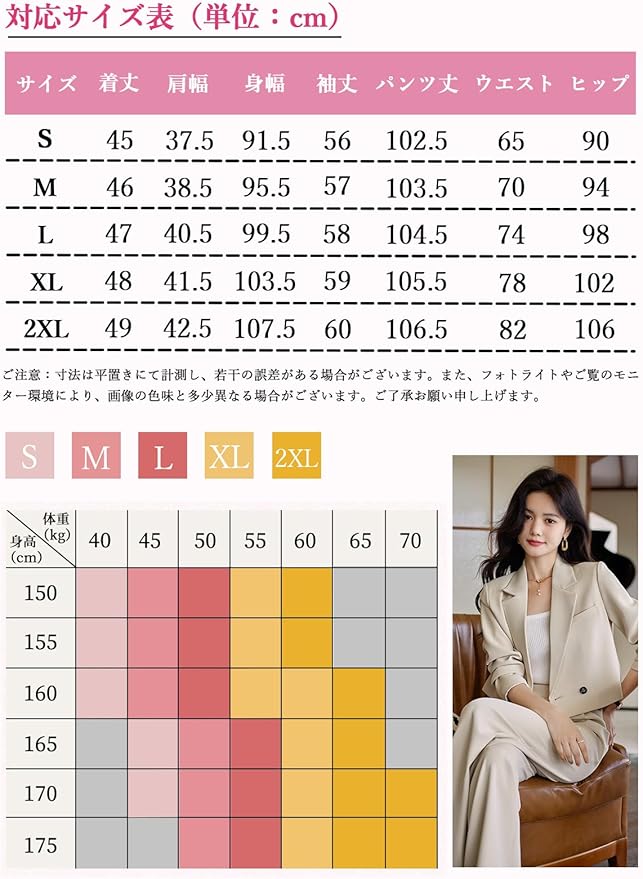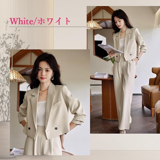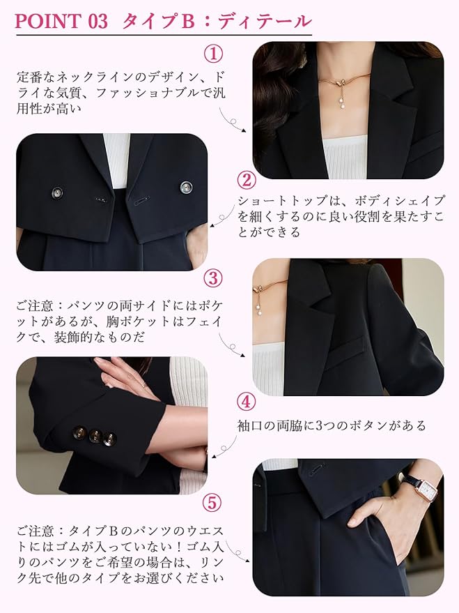 【細部まで気づかい】◎ラペルカラーのデザインは、首に自然にフィットし、あなたの気質を引き立てます。◎ショートトップは、ボディシェイプを細くするのに良い役割を果たすことができる。◎パンツの両サイドにはポケットがあるが、胸ポケットはフェイクで、装飾的なものだ。(▲ご注意▲:タイプBのパンツのウエストにはゴムが入っていない!ゴム入りのパンツをご希望の場合は、リンク先で他のタイプをお選びください。)