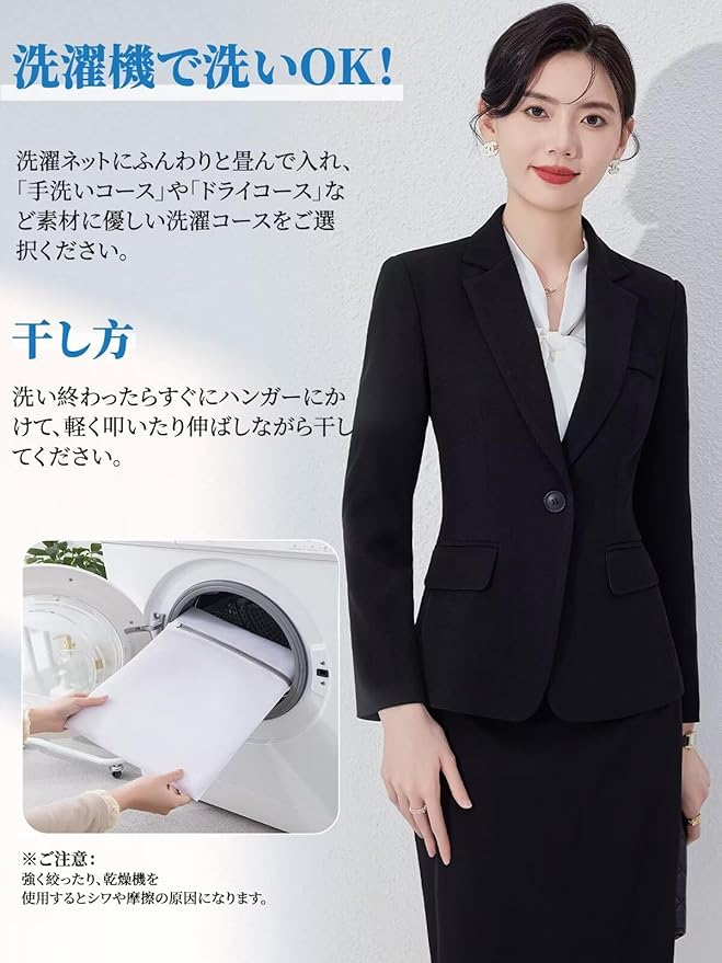 【簡単お手入れ】洗濯機対応(ネット推奨)で手間いらず。中性洗剤で30℃以内の手洗いが最適。陰干しで型くずれ防止。ポリエステル素材のため乾きが早く、シワになりにくい特性でビジネスウーマンの日常をサポートします。
