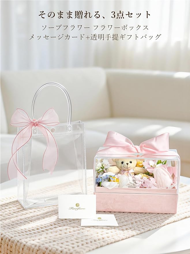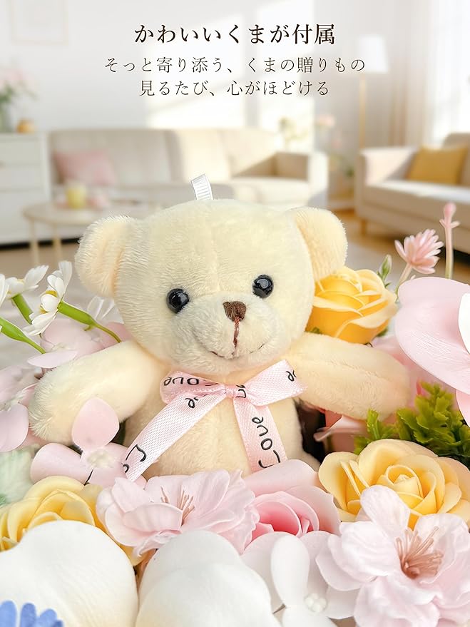 【愛らしいくま ソープフラワー|想いが伝わる花ギフト】やさしく微笑む愛らしいくまと、繊細なソープフラワーを組み合わせた、心温まるギフトボックス。見る・飾る・贈るすべてを満たす、Fiorifioreならではの花ギフトです。