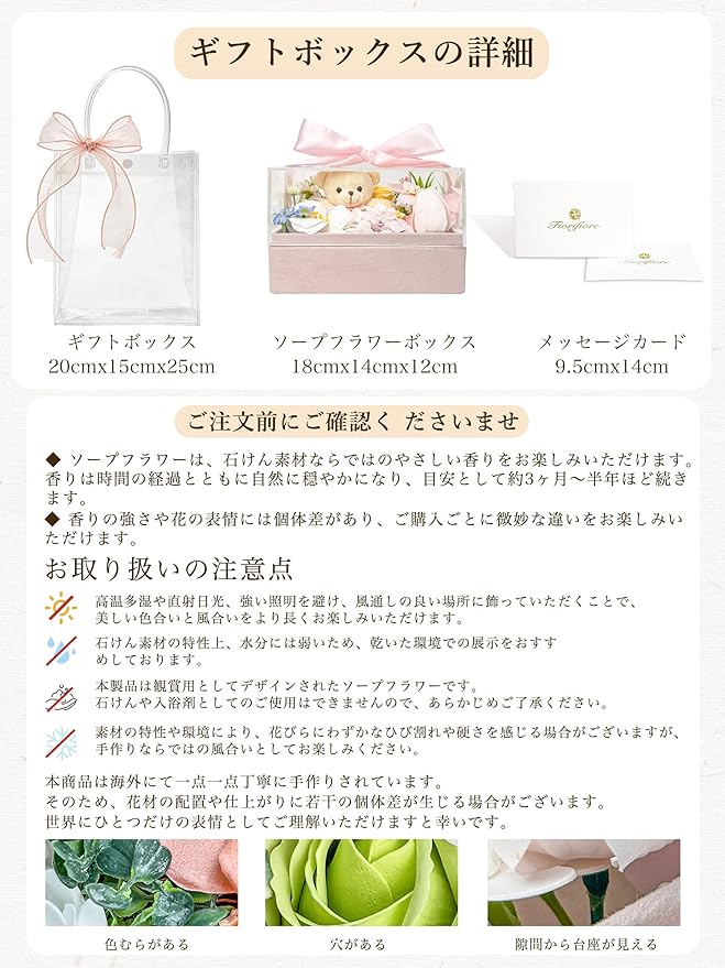 【ご使用上の注意】1.高温、多湿、直射日光を避け、通気性の良い場所で飾っていただくと、色合いや美しさをより長く保てます。2.石鹸素材を使用しているため、水濡れにはご注意ください。3.本製品は観賞用のソープフラワーであり、石鹸や入浴用品としては使用できません。4.すべて手作りのため、細部に個体差があり、世界にひとつだけの特別な美しさをお楽しみいただけます。