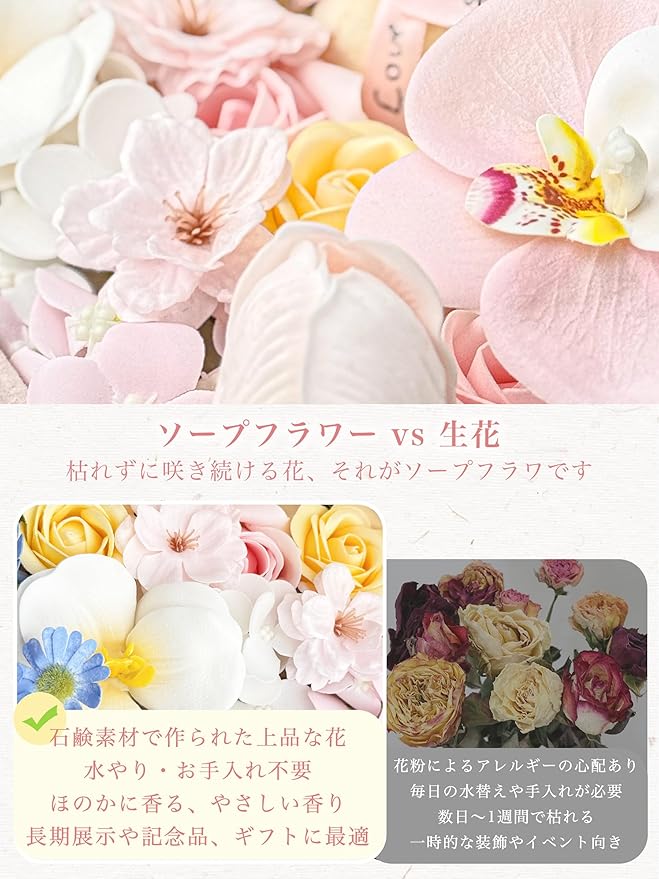 【枯れない花|花粉なしで安心のインテリア】石鹸素材で作られたソープフラワーは水やり不要。約1〜3年美しい状態を保ち、花粉を含まないため、アレルギーの心配が少なく、ギフトにも日常のインテリアにも安心してお使いいただけます。