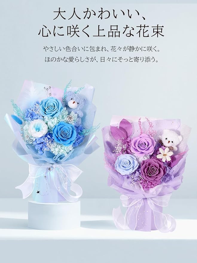 【手入れ不要、3年以上咲き続ける】高品質な生花を厳選し、日本から発展したプリザーブドフラワー技術を用い、職人より丁寧に加工されて仕上げたプリザーブドフラワーの花束。水やりやお手入れが不要で、生花のように儚く枯れることもなく、3年以上その美しさを保ちます。そのまま飾るだけで気軽に花の美しさを楽しむことができます。