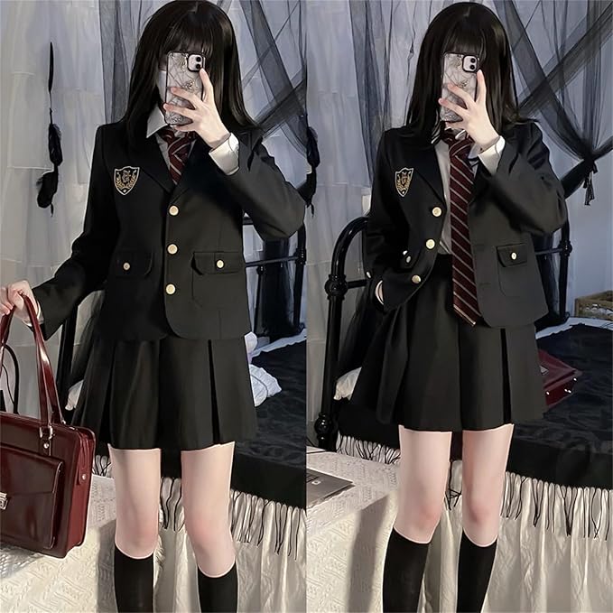 [QOOLYㅤ] 女子高生 制服 コスプレ 黒 ブレザー プリーツスカート ネクタイ 長袖シャツ 4点セット 女子高校生 JK 本格制服 学生服 コスチューム 仮装 スクールスーツ 学園祭 文化祭 卒業式 入学式