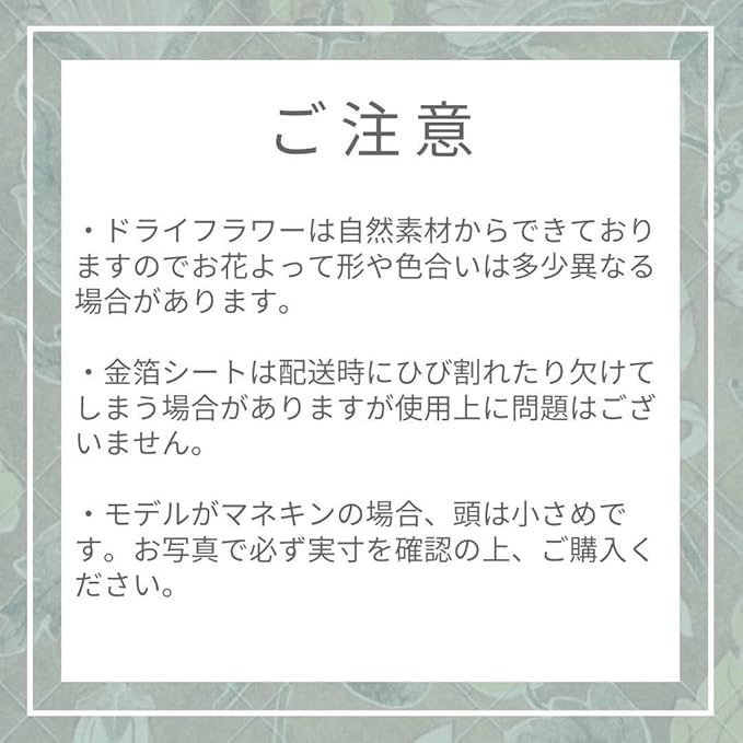 ※プリザーブドフラワー(ドライフラワー)は非常に繊細です。一度壊れてしまいますと元には戻りませんので、お取り扱いは優しくお願いいたします。※造花は何度でも繰り返しお使いいただけます。※モデルの頭は少し小さめです。ご購入前に個々のお花の大きさを必ずご確認お願いいたします。 ※お手持ちのモニターによりお色味が実際の商品と異なって見える場合がございます。※プリザーブドフラワー(ドライフラワー)は本物のお花から作られておりますので、個々のサイズやお色味が若干異なる場合がございます。