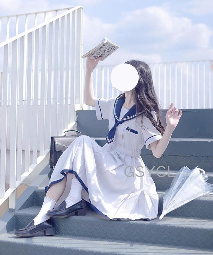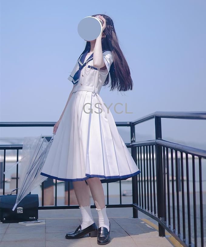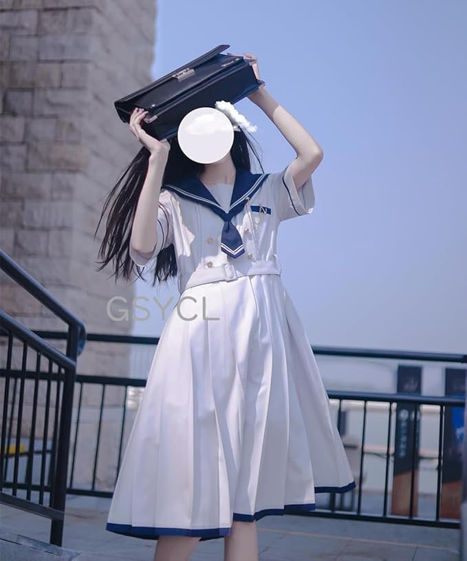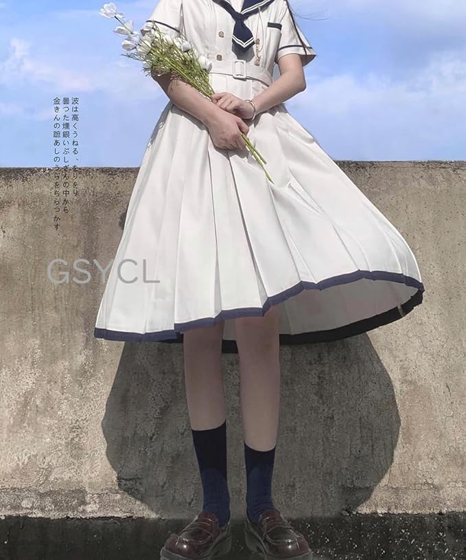 GSYCL セーラー服 ワンピース 半袖 紺色 ホワイト 女子高生 3点セット ハロウィン 衣装 JK 制服 コスチューム ロングスカート ネクタイ ベルト ボタン 女子制服 写真 撮影 文化祭 学园歳 卒業式 可愛い 森ガール (M, ホワイト)