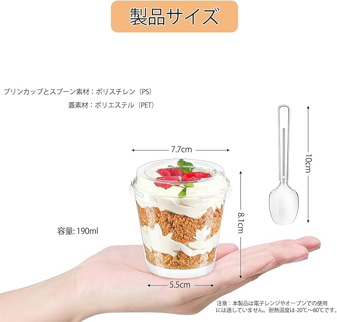 【高品質】このプリン 型、デザートスプーンはポリスチレン(PS)製で、-20℃から80℃までの温度に耐え、-20℃の冷凍庫でも安心してご利用いただけます。透明な仕上がりなので、繊細なデザートをきれいにディスプレイでき、ゲストをきっと感動させます。蓋はPET製,密閉性が良い。(注: この プリンカップ 使い捨て は電子レンジやオーブンには対応しておらず、湯煎にも適していません。)【かわいいフラットな蓋】当社の ゼリーカップ は、防塵性に優れたフラットな蓋付きで、デザートの美しさを保ち、繊細なデザートに輝きを添えます。ご注意:ご使用の際は、カップの蓋を取り外してください。【シンプルで多用途な活用】这款 使い捨て容器 蓋付き パッケージ内容:デザートカップ100個、透明フラット蓋100個、デザートスプーン100本、1個/幅7.7 奥行5.5 高さ8.1cm、満水容量:190ml、プリンはもちろん、ゼリー・ムース・パンナコッタなど様々なデザート作りに活用可能。これらのデザートカップ 使い捨て は、自家製デザートの包装、パーティーデザートの盛り付け、小規模な商業用途にお使いいただけます。【見た目にも美しい透明感】プリンカップ 使い捨ては透明な外観で、繊細なデザート、パフェ、フルーツ、ヨーグルト、アイスクリーム、ムース、スナックをプロフェッショナルに見せるのに最適です。この プリンカップ 蓋付き は積み重ねて収納でき、場所を取りません。【あらゆる機会に最適】このプリン容器は、誕生日パーティー、結婚式、ベビーシャワー、ケータリングカクテルパーティー、バーベキュー、プロモーションテイスティング、ビュッフェ、卒業式、休日のお祝い、休日の集まりなど、多くの機会に最適です。※ 万が一商品に不具合がある場合、メール等でご連絡を頂けましたら迅速に対応致します。