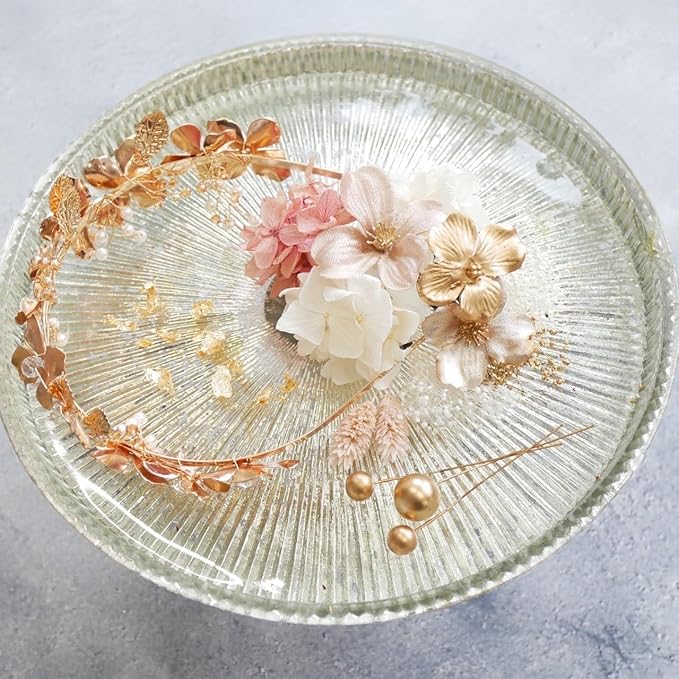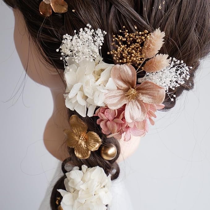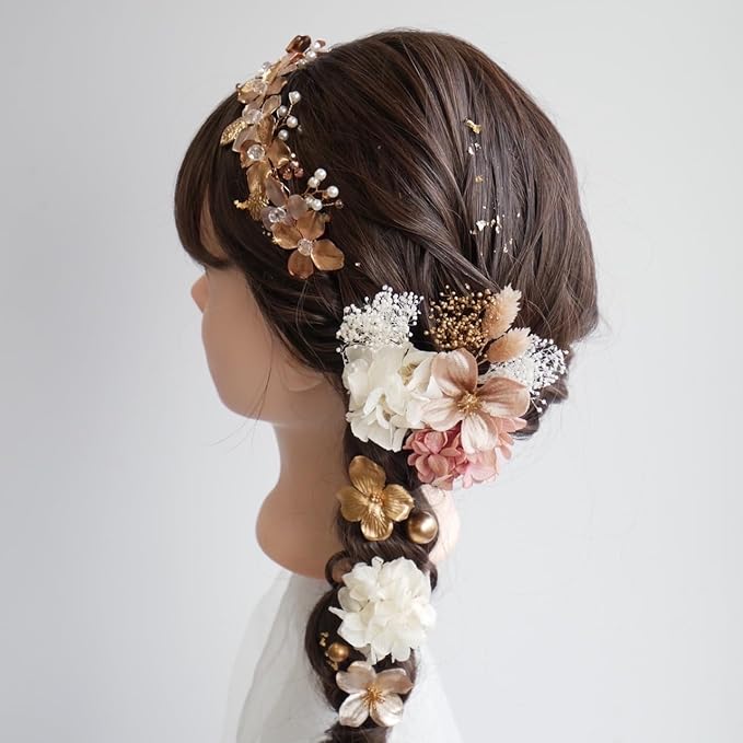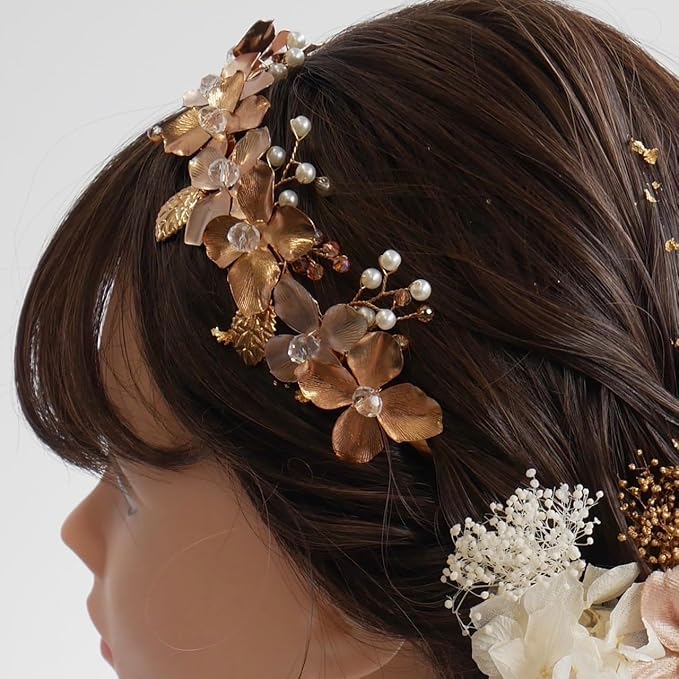 ♦︎パーツ詳細♦︎ ピンクゴールドカチューシャ ドライフラワー7パーツ アートフラワー3パーツ ゴールドパール ブロンズ箔