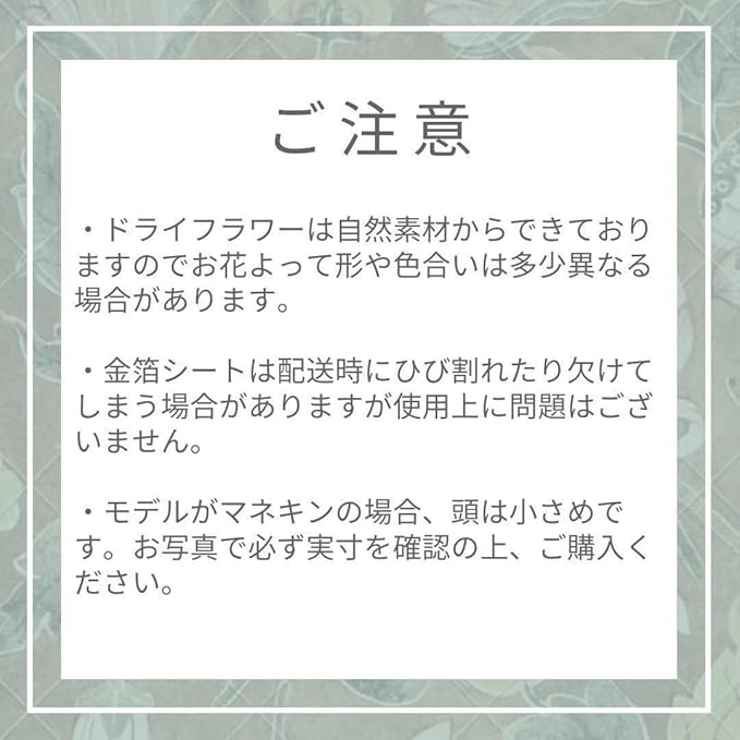 ※プリザーブドフラワー(ドライフラワー)は非常に繊細です。一度壊れてしまいますと元には戻りませんので、お取り扱いは優しくお願いいたします。※造花は何度でも繰り返しお使いいただけます。※モデルの頭は少し小さめです。ご購入前に個々のお花の大きさを必ずご確認お願いいたします。 ※お手持ちのモニターによりお色味が実際の商品と異なって見える場合がございます。※プリザーブドフラワー(ドライフラワー)は本物のお花から作られておりますので、個々のサイズやお色味が若干異なる場合がございます。