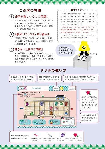 お子さまを惹きつけてやまない、「うんこ」を使った問題を通して、自然と学ぶ楽しさや新しいことを知る面白さに目覚めてほしい。また、自分に自信をもって小学校入学という門出の日を迎えてほしい。そんな願いから、このドリルを作りました。