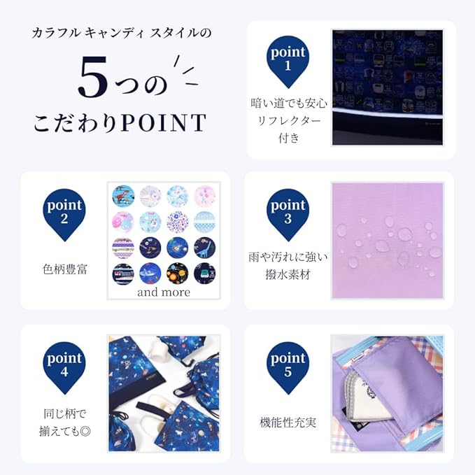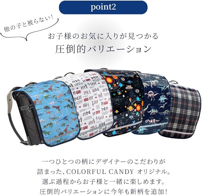 キッズ&ベビー用品のCOLORFUL CANDY STYLE (カラフル キャンディ スタイル) は入園・入学グッズからキッズ向け各種ライフスタイルアイテムまで豊富な色柄をラインアップ。 大切なお子様が「毎日使うもの」を選択するなら、マーケットでひとくくりに「幼稚園児用」、「小学校低学年用」と分類されたものや大量生産のキャラクターだけを選択肢にすることでよいのだろうか、という疑問から当限定商品は始まりました。 お子様一人ひとりの興味や個性、ご家庭の教育方針やご両親の好み・センスは千差万別です。 また、子供の成長の度合いがそれぞれに異なることはママやパパならどなたでも実感されていることでしょう。 毎日こどもが手にするものだからこそ、一人ひとりの個性や発達段階に沿ったものを選ぶべき、と考えます。