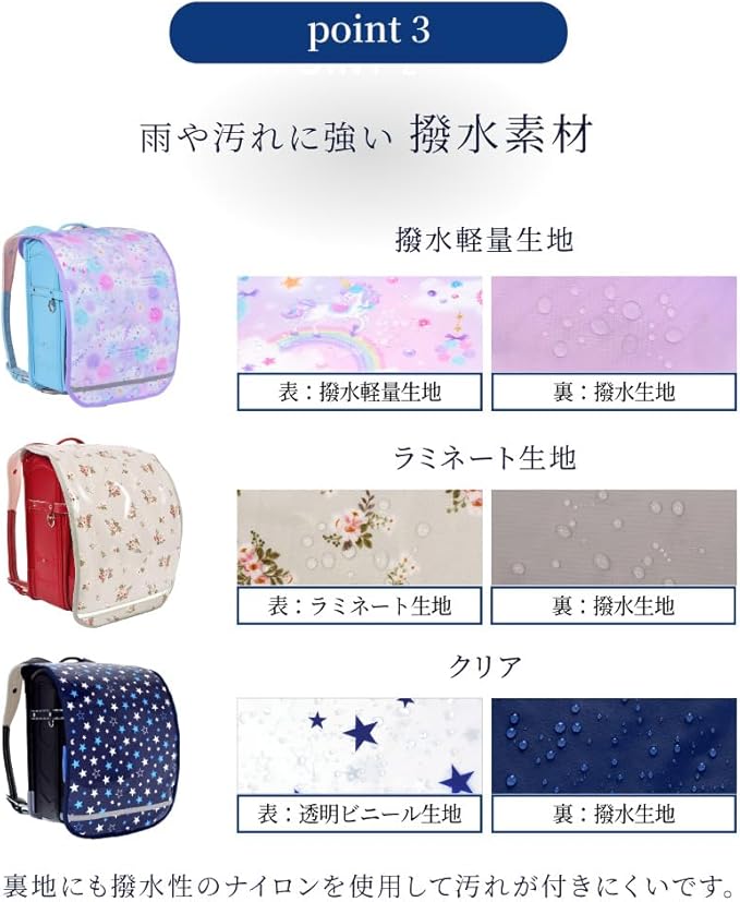 プリントデザインが魅力的な透明ビニール生地。ランドセルの色味を活かしながら、お気に入りデザインが楽しめる、透明度の高いビニール生地を採用。