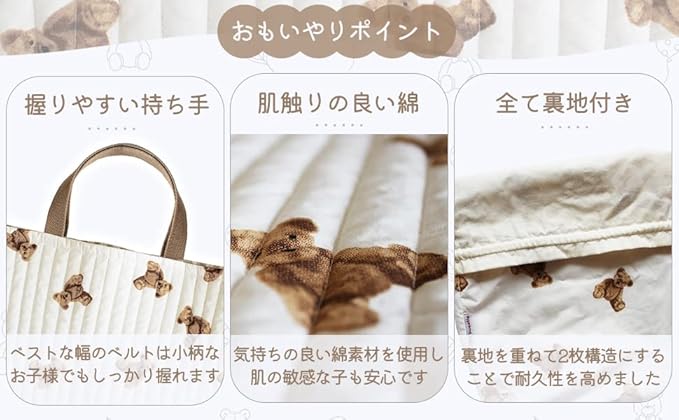 仕様:キルティング生地・リバーシブル(レッスンバッグとシューズケースの2点)、5点全てマチと裏地付き