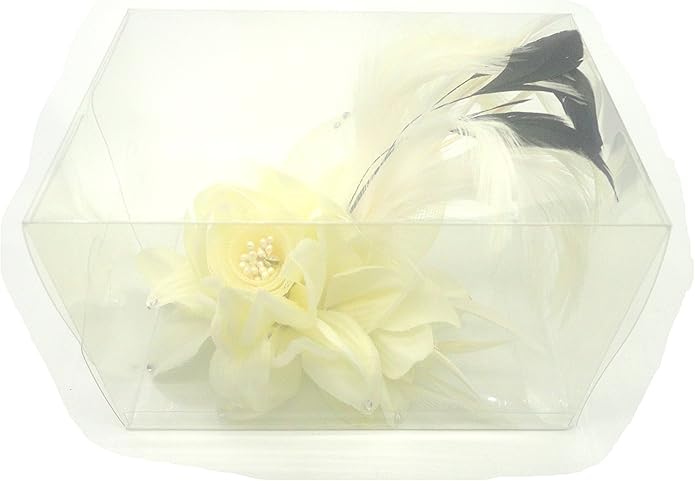 羽付きの美しいコサージュ・髪飾りです。クリアケース入りで型くずれがありません。