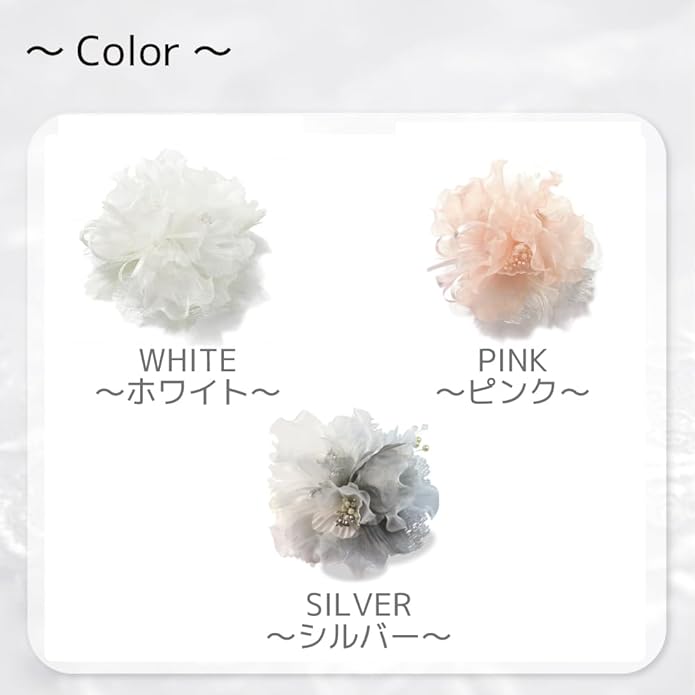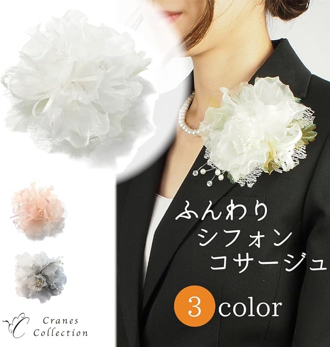 ■ふんわりシフォン生地を重ねて仕立てた柔らかな雰囲気のコサージュです。ワイヤーパーツやリボンがアクセントに。