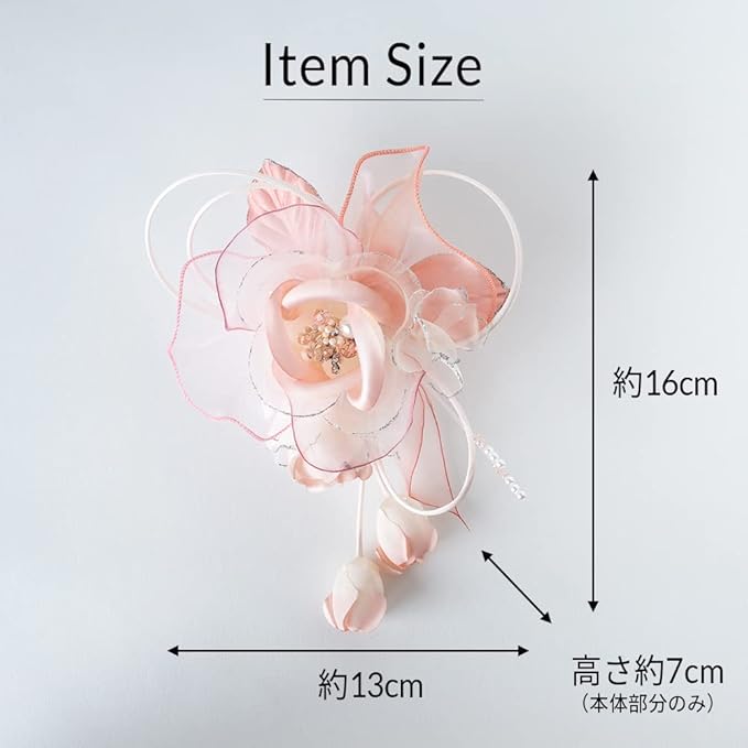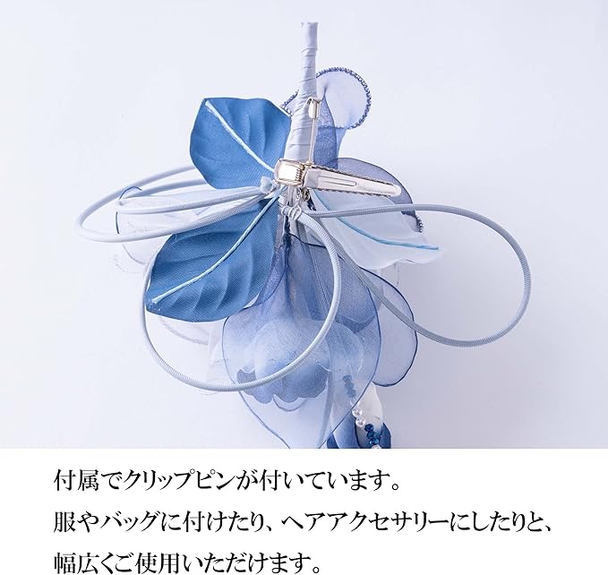 【仕様】:2WAYタイプ(ブローチピン&クリップ)コサージュ、ヘアアクセサリーとしてとしてスーツ、ドレス、着物に合わせたり、バッグになど取り付けるアクセサリーとしてもお使いいただけます。