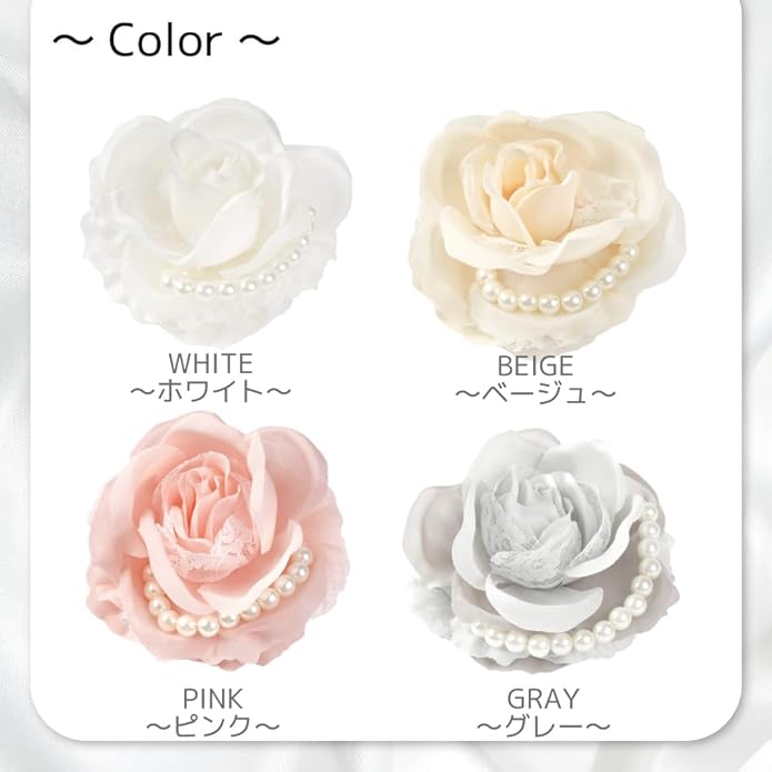 ■ふんわりキュートな仕上がりに:ふんわりした花びらを重ね、立体的なローズコサージュに仕上げました。さらにワイヤーで組み付けたパールがアクセントに、全体的にキュートな雰囲気になりました。花びらの生地も3種類組み合わせシンプル且つキュートなコサージュです。ナチュラルホワイトカラーでお洋服を選ばずお使いいただけます。
