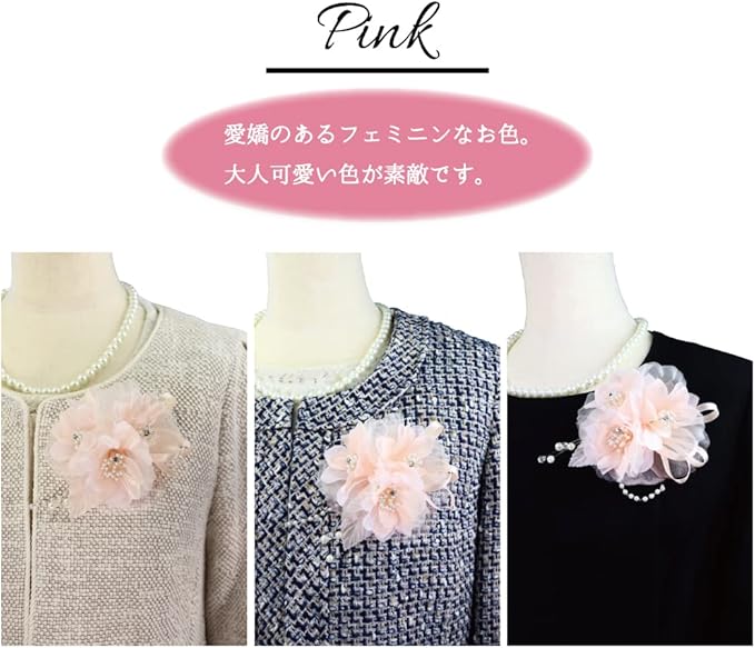 ■合わせやすいパステルピンクカラー:どんなお洋服にも合わせやすいパステル ピンクカラーはさりげなく胸元をエレガント に彩ります。 淡い中間色を使用しており、あえてラメ装飾 はしておりません。